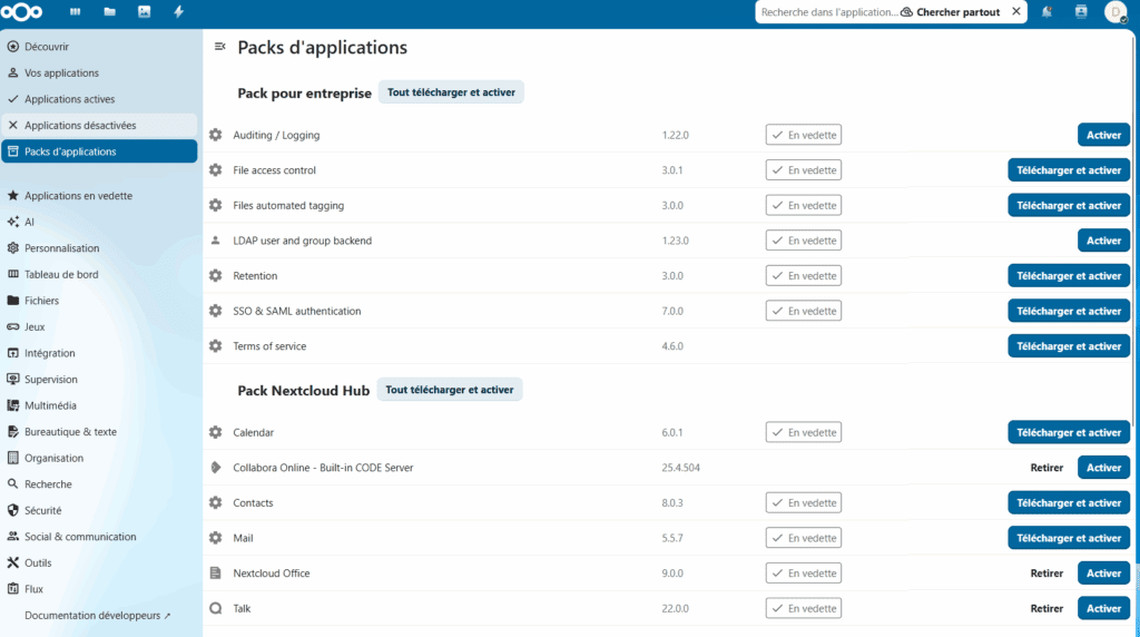 Dans l’interface de Nextcloud allez dans applications packs d’applications et recherchez Nextcloud Talk pour ensuite la télécharger et l’activer