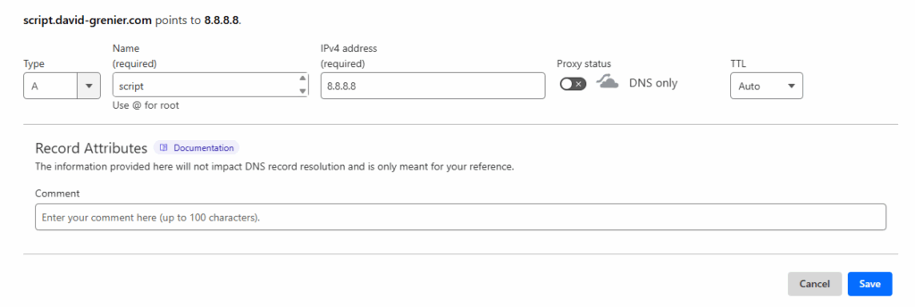 Avant de tester le script, vous devez créer un enregistrement A pour que le script puisse pointer vers votre domaine.